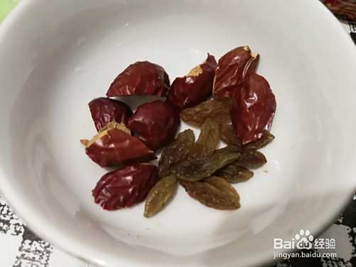 红枣洗净去核切成小块,葡萄干洗净备用。