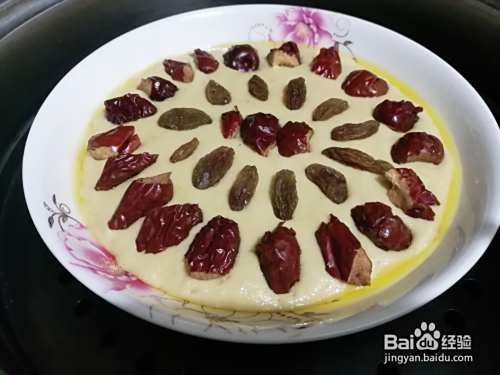 将葡萄干,红枣块摆放在面糊上,盖上盖醒面10分钟。