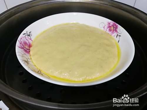 准备一个盘子,盘底涂抹食用油(以免做好的发糕粘盘底),放入面糊。