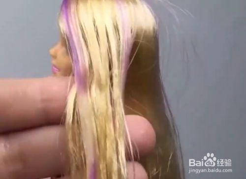 在梳子上涂上紫色的颜料,抓起芭比娃娃的一部分头发梳头