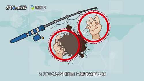 4左手夹住饵料团上爆炸钩的主线,右手拉爆炸钩,让爆炸钩的子线像灯孔的筋骨一样紧紧拉拢住饵料团。