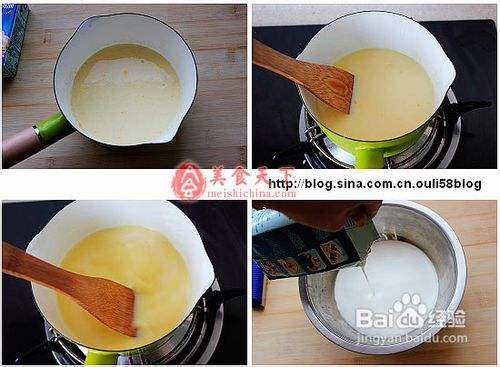 将蛋奶液小火加热并不断搅拌,蛋奶液在接近沸腾时关火,冷却备用。