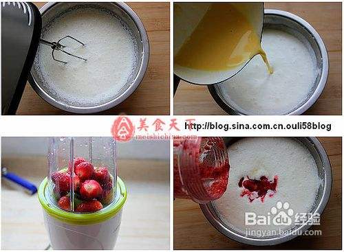草莓洗净后摘蒂,放搅拌机里打成酱,倒入奶油液里搅打均匀,放入可以冷冻的容器内,放冰箱冷冻室,每隔一小时拿出搅拌一次,搅拌三四次即可。(从上午9点冻到下午四点)