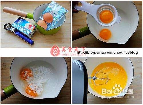 蛋黄加入白糖搅打均匀,加入牛奶搅打均匀。