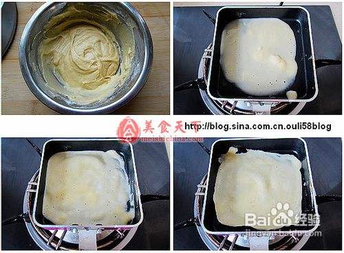 平底锅加热,倒入少许面糊,晃荡均匀,小火加热。