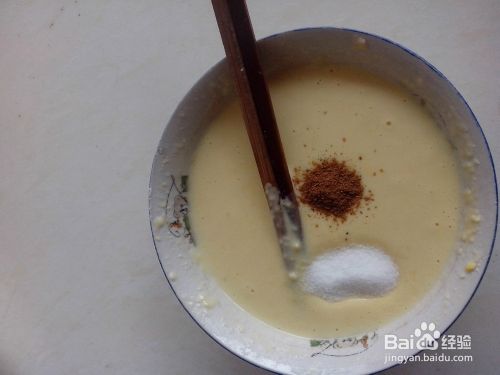 在打好的糊中加入五香粉,盐。接着打匀待用