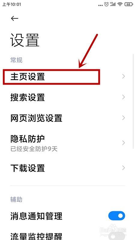 进入【设置】页面后,选择【常规】选项组下的【主页设置】选项点击