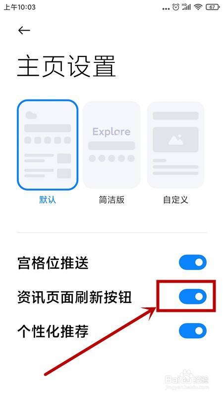 在打开的【主页设置】界面,选择【资讯页面刷新按钮】功能按钮点击,即可关闭该功能