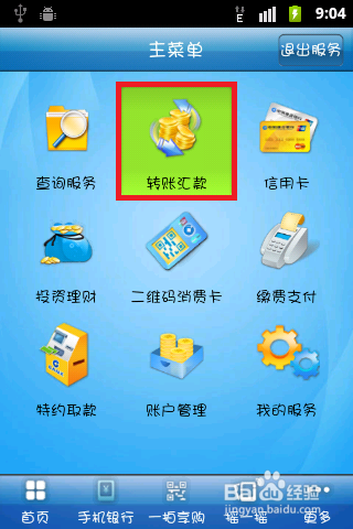 在进入主菜单界面后,点击其中的“转账汇款”按钮进入。