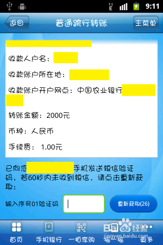 最后在详细付款界面中,输入手机验证码,即可完成跨行转账汇款操作。