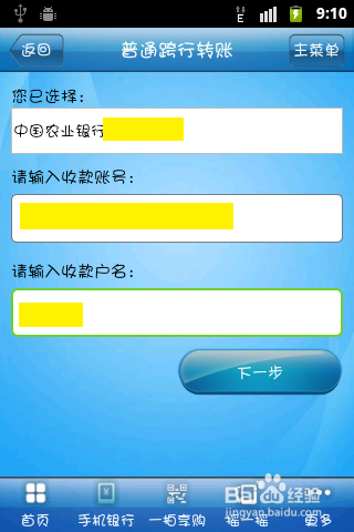 接下来,输入“收款账号”以及“收款户名”,点击“下一步”。