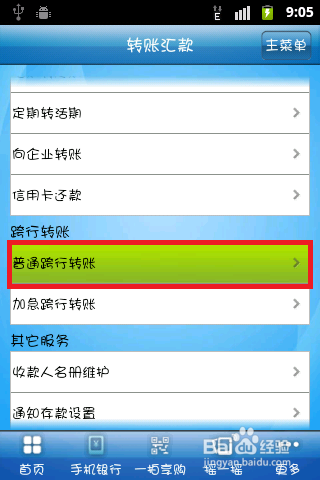 在“转账汇款”窗口中,点击“跨行转账”-“普通银行转账”项进入。