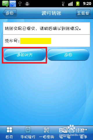 然后就可以看到“转账交易已提交”界面,在此界面中我们可以点击“通知对方”按钮,以短信形式通过收款方及时查收转账汇款情况。