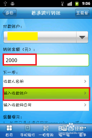 接着选择“付款账户”、“转账金额”,同时点击“输入收款账户”项进入。