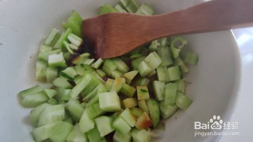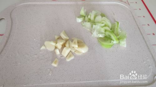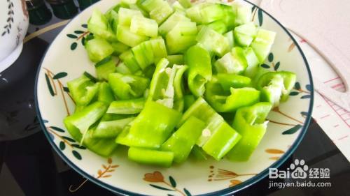 黄瓜洗净去皮切成黄瓜丁,青椒切成块,葱蒜切成片,备用