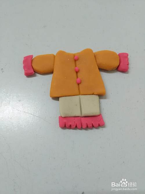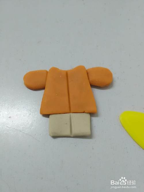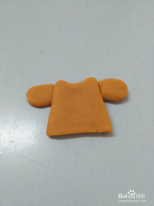 用桔色捏两个椭圆形,用小刀将椭圆形的一边切掉,粘在衣服两侧,当作袖子。