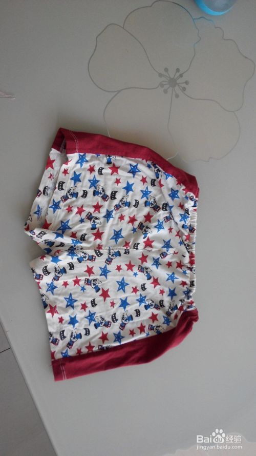 把短裤平铺到桌面上,开档的两条布边对整齐。