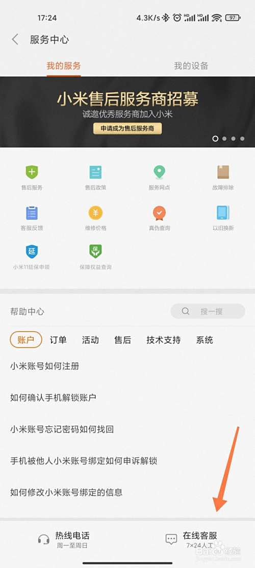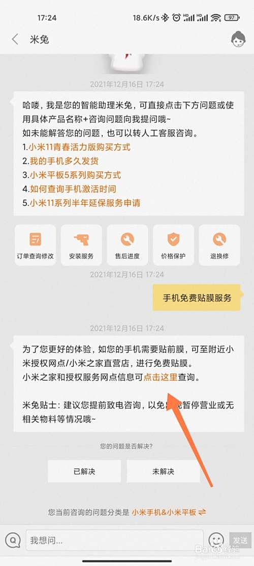 小米手机想要免费贴膜,在商城APP的在线客服中,获得消息,查看附近网点前往贴膜。以下是具体的操作步骤: