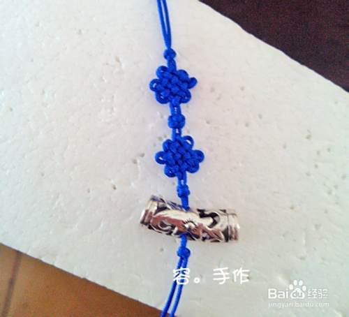 完成二回盘长结后编一个纽扣结;接下来再编一个二回盘长结,继续再拜年一个双联结。然后穿过短宽弯管。再编个双联结。附纽扣结的编法。