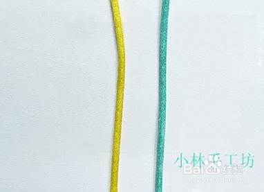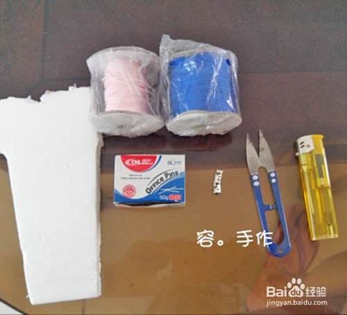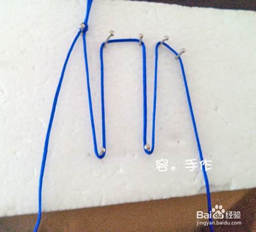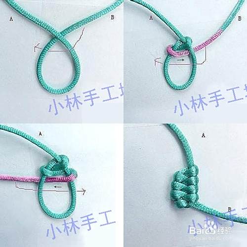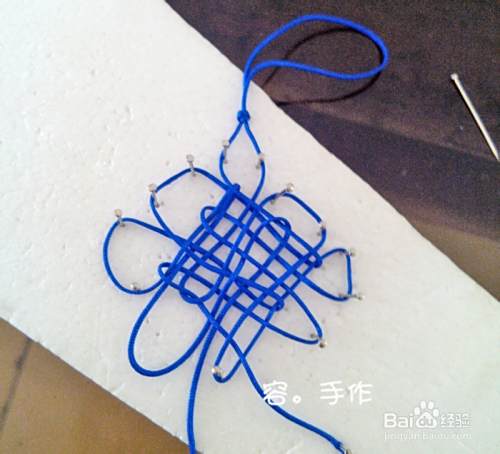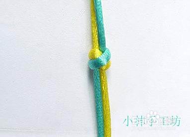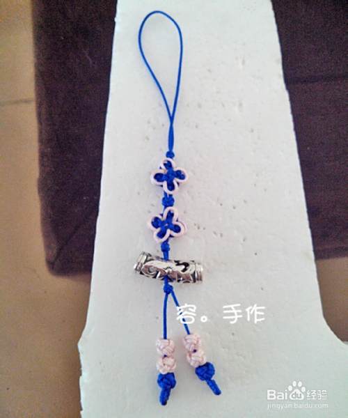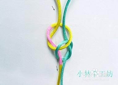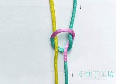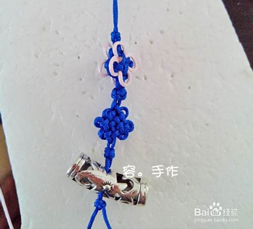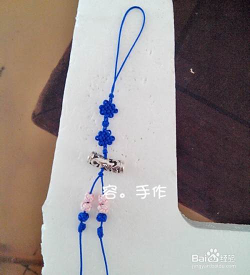 编钮扣环。编4个浅粉色钮扣环,2个宝蓝色钮扣环。然后串过两根线在下面编一个八字结。附八字结的编法。