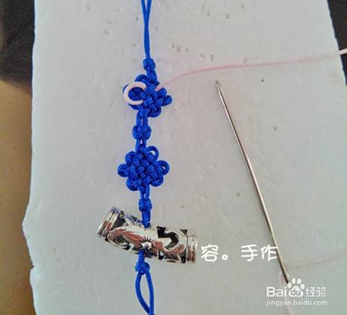 用缝衣针串一段浅粉色的玉线,在二回盘长结上面串出花形。多余的线剪掉烧粘一下藏好线。