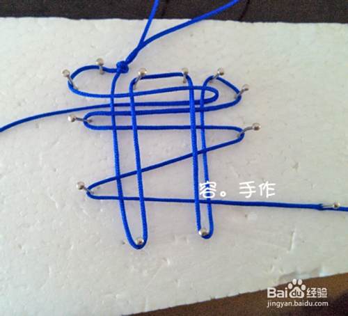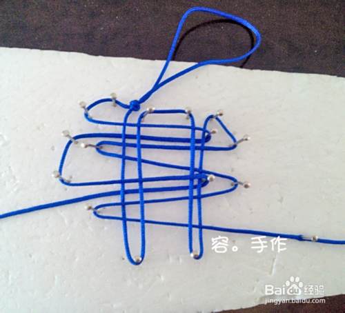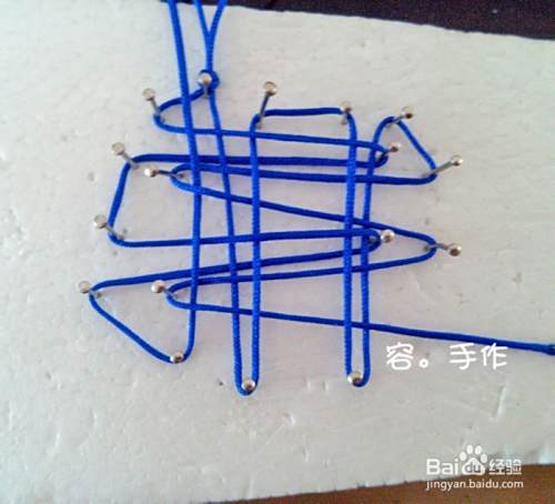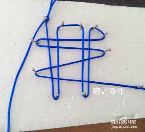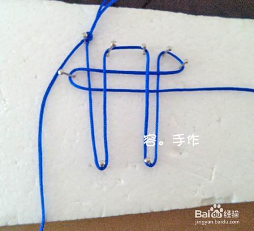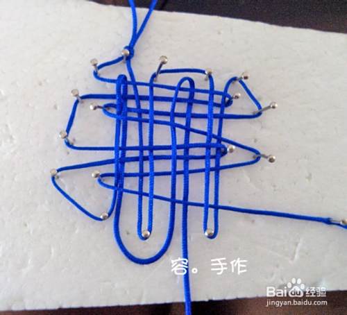 接下来编二回盘长结,要用到工具:泡棉和钉书针。钉书针起到固定的作用。记一下有一个口诀:压一挑一、压一挑一;这个是第二幅图的口诀,第三幅图口诀是一样的。这里是双线做口诀的动作哦。