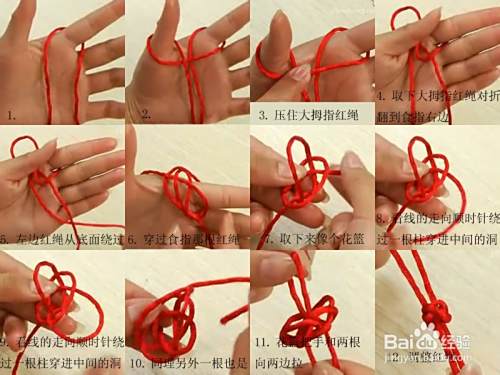 接下来的口诀:挑一压三,挑二压一挑三压一挑一出;第一图和第二图的口诀。第三图是第一和二一起做。二回盘长结就算完成了,然后将钉书针取出,整形。