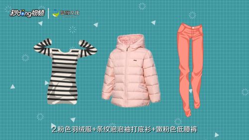 4粉色羽绒服加条纹泡泡袖打底衫,加粉色低腰裤。