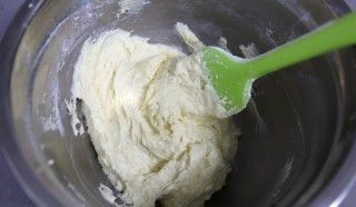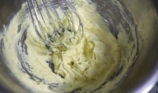 加了蛋黄的黄油糊呈柠檬黄、蓬松、黏稠状;打好后放一旁备用;