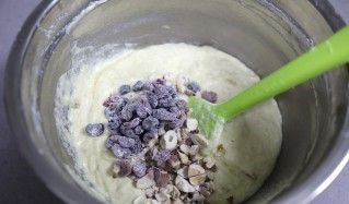 将坚果和果干倒入香蕉面糊中,搅拌均匀;
