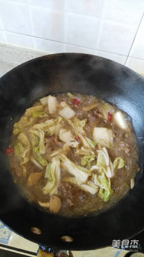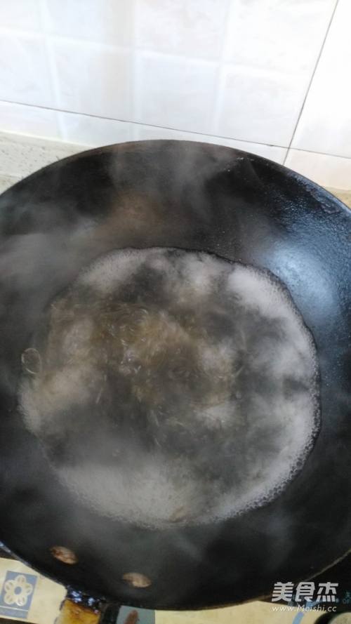 4锅中放入清水,也可以放入高汤,更有味道哦。倒入红薯粉