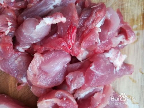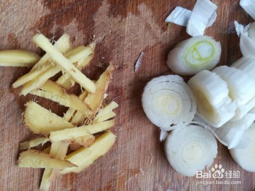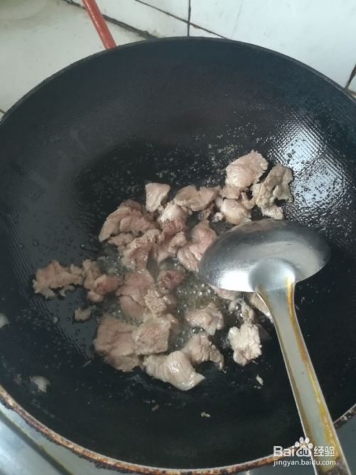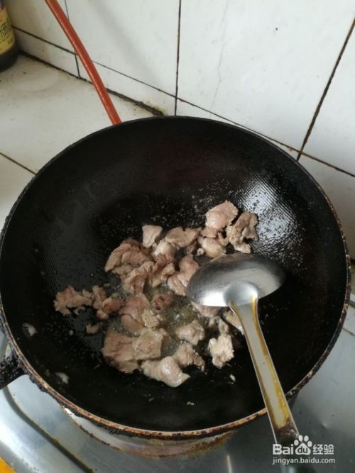6放入肉煸炒,肉色变白后,加入葱姜,翻炒。