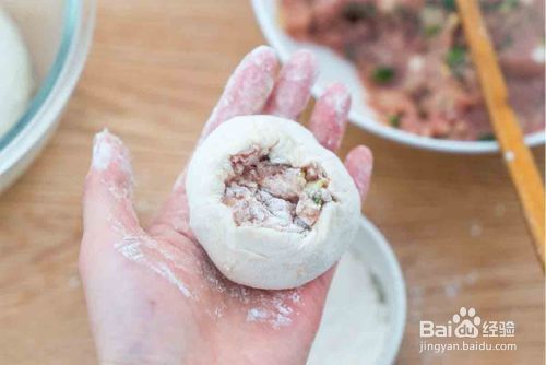 面团稍微压扁,放上一个揉好的内陷,将饼皮均匀的往上推,慢慢收口。最后把多出来的面皮揪掉,这个方法可以让饼皮包成薄薄的一层