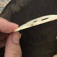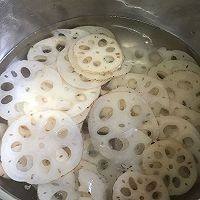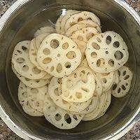 用一大碗,放少许盐和水搅拌成盐水,将莲藕片放入淡盐水中泡15分钟,凉水干净