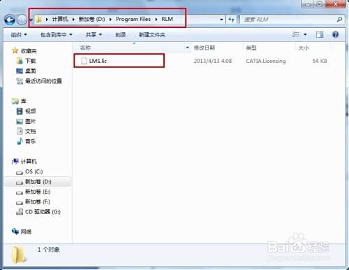 首先,在需要安装LMS Virtual.Lab的磁盘分区(例如安装到D盘)建立一个文件夹,用于存放证书文件,例如在D:\Program Files下建立一个RLM文件夹(这个文件夹用于存放证书,一般要求文件夹中无中文名,可以建立在任意位置),然后,将LMS.lic(破解文件中的证书文件)拷贝到该文件夹下。