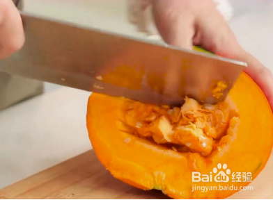 准备一个小南瓜,清洗干净,之后将南瓜切开,从顶部给切开,之后将南瓜里面的瓤给挖出来,之后把南瓜再给清洗一下,之后放在一边备用。