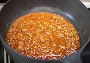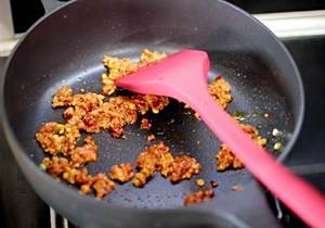 锅里加入适量油,爆香葱姜蒜末,加入一丁点剁细的豆瓣酱,炒香,然后加入牛肉末翻炒。如果给比较小的宝宝吃就别放豆瓣酱,大一些的孩子可以根据自家口味来定。