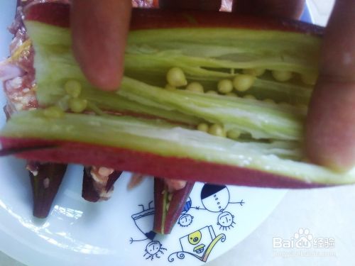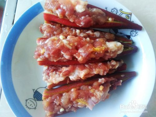 把秋葵清洗干净,然后切去顶端,再用刀把它裂开,然后把腌制好的肉饼填进去。