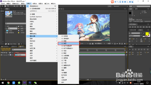 选中图层面板的素材,点击菜单栏的效果——模拟仿真——CC 降雨(2019班版本的AE 是CC Rainfall)。