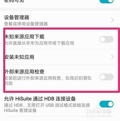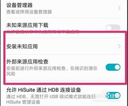 下拉列表,找到未知来源下载和外部来源应用检查。