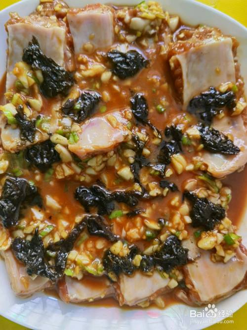 腌制好了以后摆入盘中,把剩余的料汁撒在上面,个人喜欢放点橄榄菜提味
