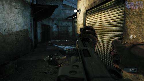都干掉之后下楼和队友会合。 接下来和队友杀到一个院子里,干掉敌人之后踢开房门进去,我们和一个队友在左边,另外两个队友在右边,杀光屋里所有敌人后从房间另一边的门出去。