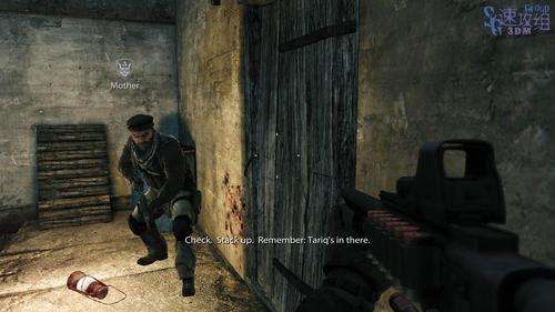 等队友开门后跟着出去。 到了外边之后配合队友干掉周围的敌人,然后到图中位置的门前,按F踢开门后进入。对了,没子弹的时候可以对着队友按F要子弹,