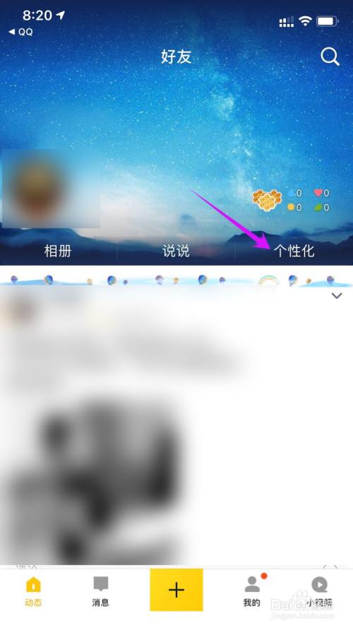 打开手机上的QQ空间软件,点击“个性化”功能。