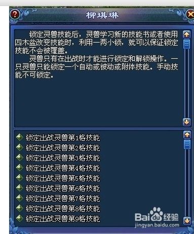 冲开之后就得到5个垃圾的普通附体技能。这个时候商城-元宝区-灵兽-雀翎锦囊,买个甘泉。同样的放入乾坤袋勾选宝宝转,这个时候甘泉会顶替其中一项,不用怕冲开6个格子,这个概率太小了,如果冲开6个,那直接拿去卖,大几百万到手。废话不说,甘泉顶替其中一项后,我们就有了个有用技能,去金陵的柳琪琳那里,进行灵兽技能锁定。