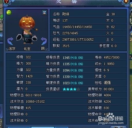 首先,得选个附体灵兽A,一般选80修的选武魂,因为武魂前三项资质很高,也比较平均,这里我选了个南瓜,成长1.995,原始资质1100+(智力和力量按最高的一项算的)。效果跟亲密度还有悟性有关,所以最好收个亲密度和悟性高的灵兽,自己提很耗钱的。