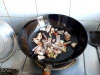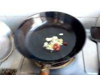 热锅上油,放入姜丝、蒜片和干红辣椒,炒香。