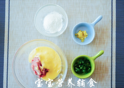 1准备食材:白萝卜40克、羊肉40克、玉米淀粉5克、山药30克、姜末适量、鸡蛋1个、葱花适量。