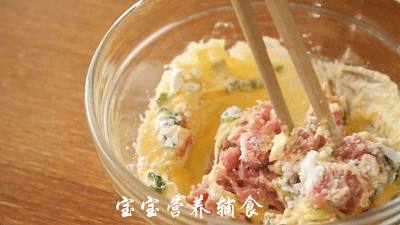 10把山药糊加入肉泥中,接着加入玉米淀粉和葱花、姜末。