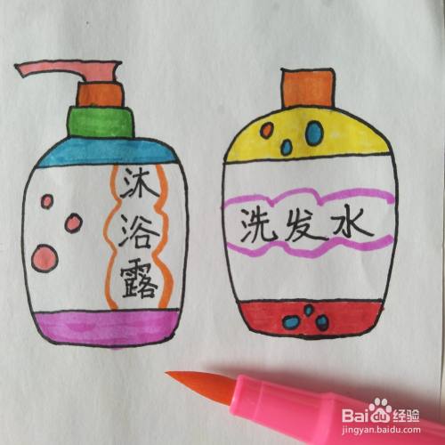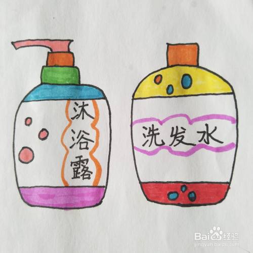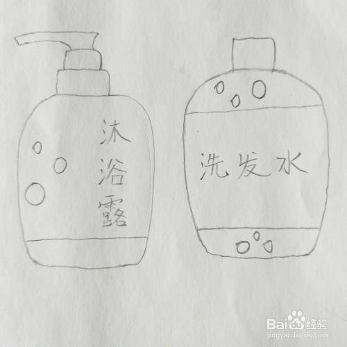 洗澡时需要用到洗发水和沐浴露等洗漱用品,准备好绘画的工具,我们用简单的笔画将洗发水和沐浴露瓶画出来吧。